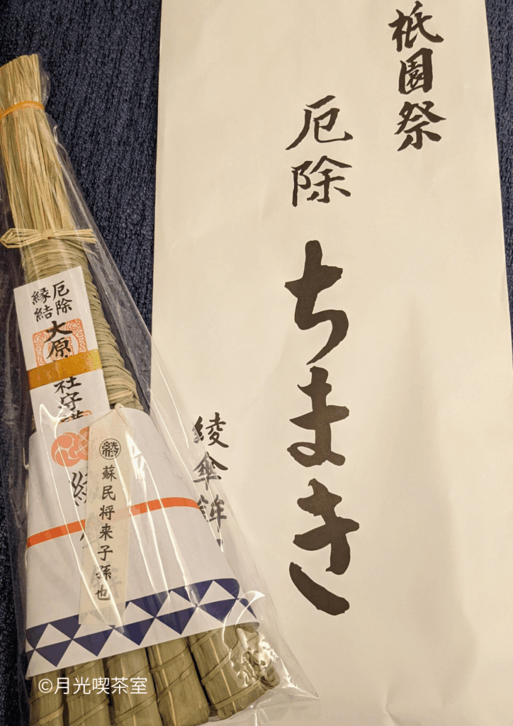 - 由来: その昔、蘇民将来(そみんしょうらい)という貧しい男が、宿を貸した牛頭天王(ごずてんのう)から「お礼に、お前の家系を疫病から守ろう」と約束された伝説に基づいています。ちまきには「蘇民将来子孫也(私は蘇民将来の子孫です)」という札がついています。