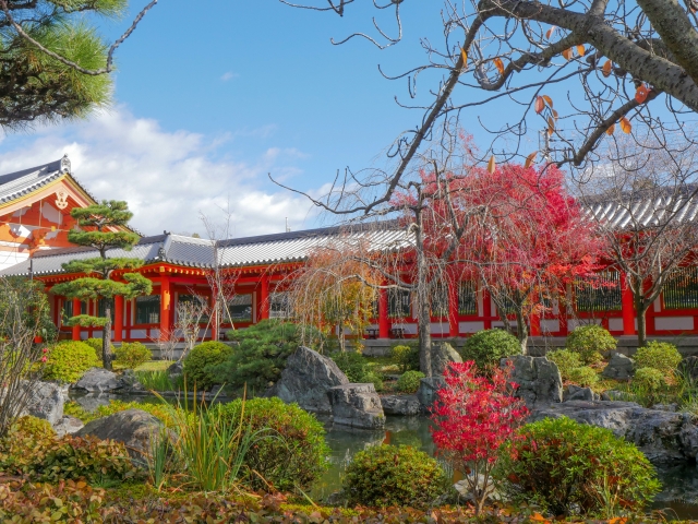 紅葉のピークは 11月中旬〜12月上旬。境内の木々が色づき、長い本堂の回廊を背景に赤や黄色のコントラストが広がります。庭園の紅葉は派手さはないものの、観音像の荘厳さと調和して心を落ち着かせてくれる景観です。