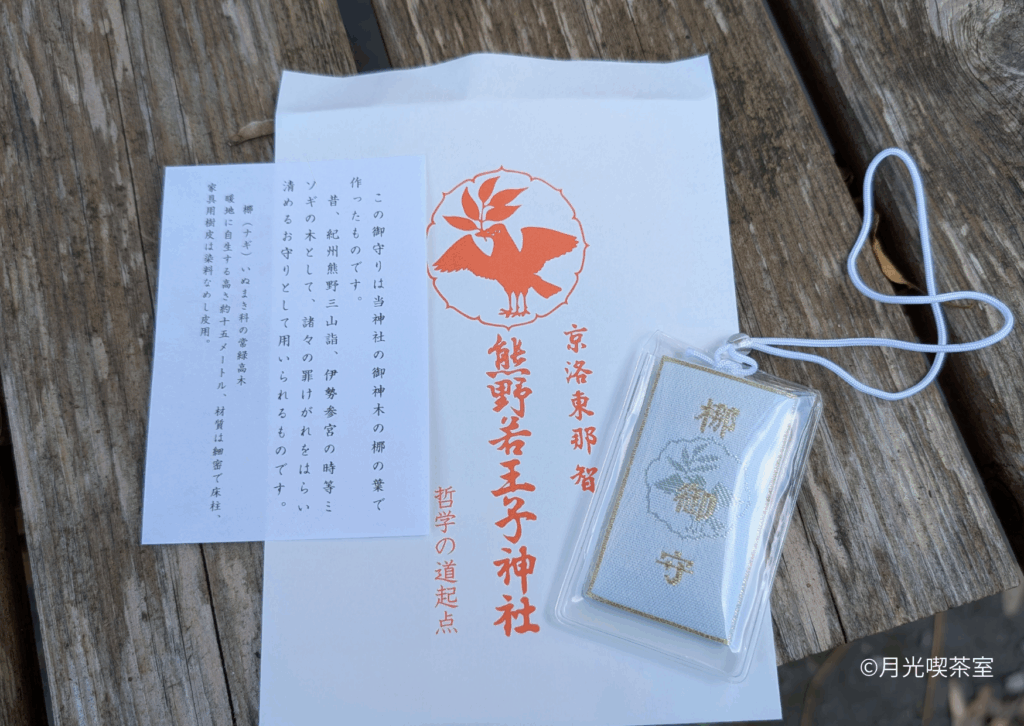 社務所では、御神木である梛(なぎ)の葉で作られたお守りをいただきました。