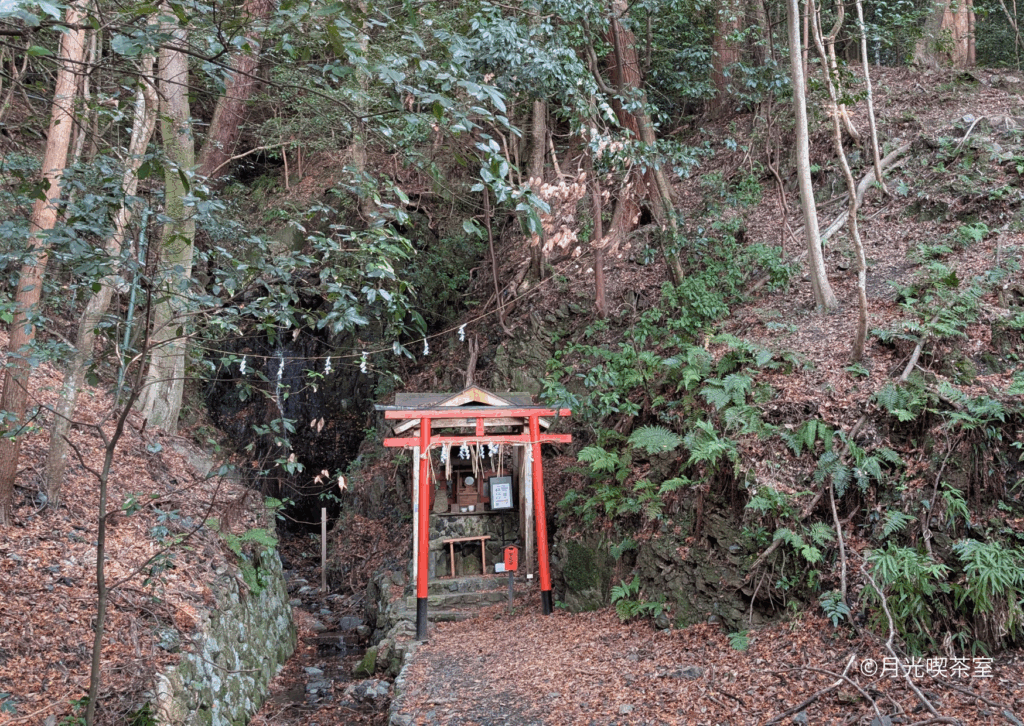 鳥居の奥には、小さなお社と、静かに流れる滝。