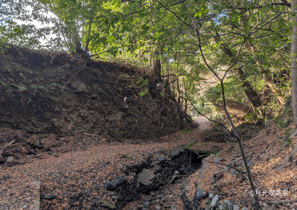 細い横道へ入っていくと、小川が流れ、谷のようになった森の道が続いています。