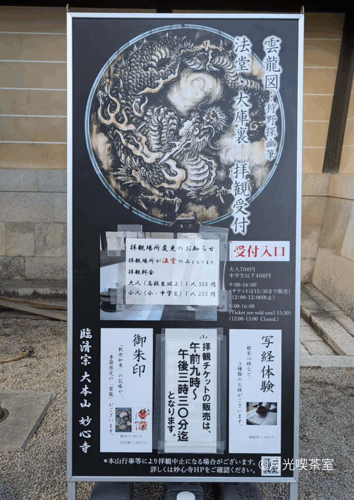 令和6年5月20日より約2年間終日、工事のため大庫裏の拝観は休止中。 拝観可能なのは法堂のみ(拝観料500円)
