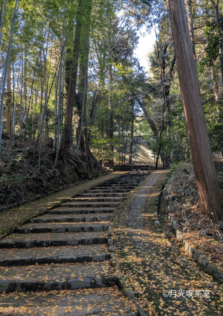 左手には盛り土か石垣が続き、その上には赤いカエデの葉が静かに落ちています。