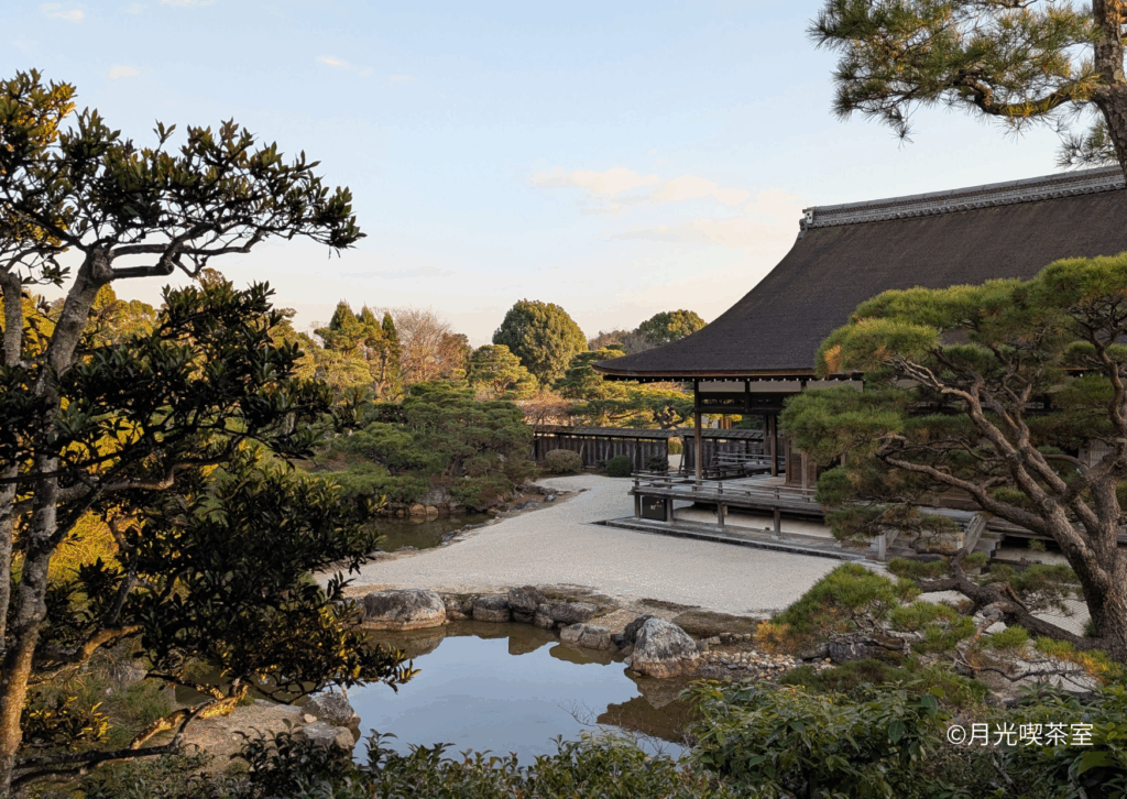 御所庭園でゆったり過ごす時間、夕暮れの境内を歩くひととき。