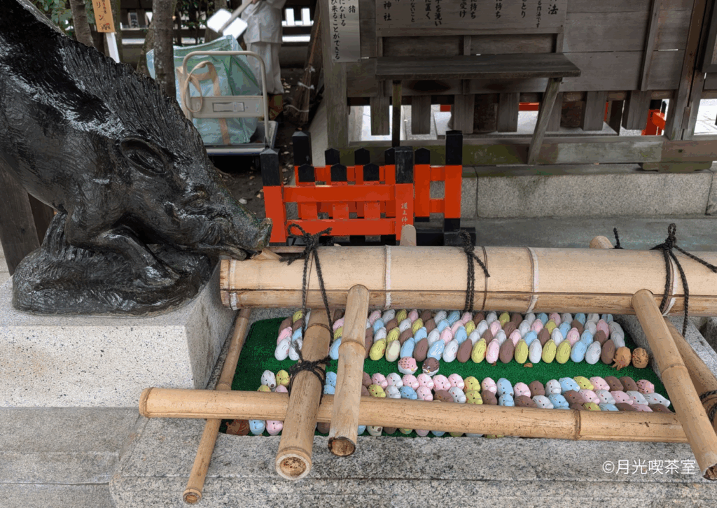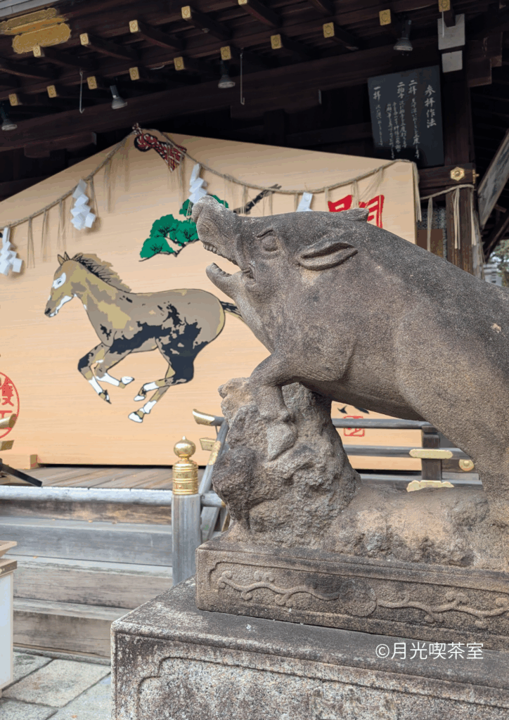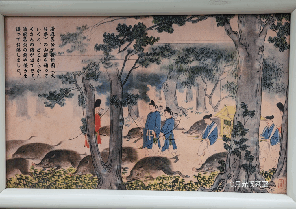 三百頭の猪が現れ、清麻呂を守り、脚も回復したと伝えられています。