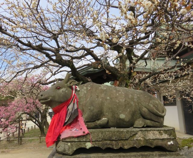 天神さまこと、菅原道真公が丑年生まれであったことから天神さまの使いとして牛が崇められています。境内には沢山の臥牛が鎮座していて、撫でるとご利益があると言われています。