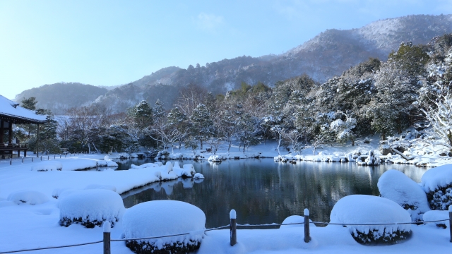 - 雪化粧の曹源池庭園 池の水面に映る雪景色と、奥にそびえる嵐山の稜線がまるで一枚の水墨画。白と墨色の世界に、心が吸い込まれます。