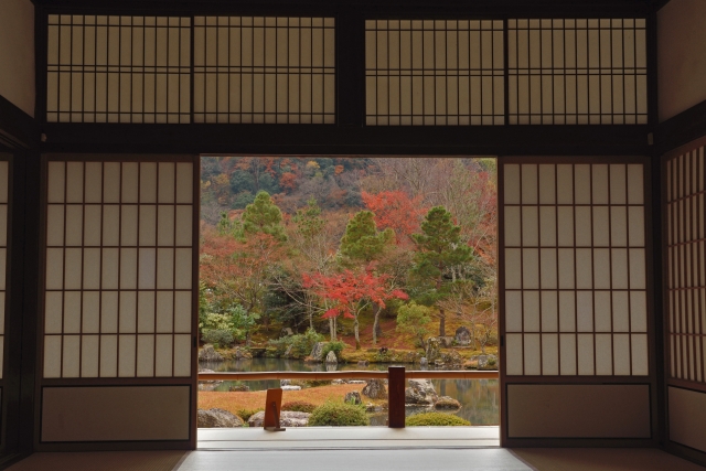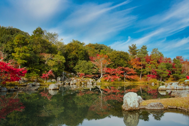 世界遺産・天龍寺は、嵐山を背景に広がる曹源池庭園とともに、京都を代表する紅葉の名所です。広大な庭園を歩けば、池の水面に映る紅葉や嵐山の借景に心を奪われ、自然と深呼吸したくなるような時間が流れます。一人旅でも安心して訪れられるスポットとして、多くの旅人の心を和ませてきました。