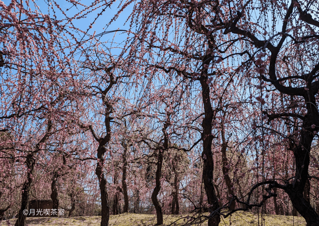 春になると、境内に広がる「しだれ梅と椿の庭」が一面の花で埋め尽くされ、まるで平安絵巻のような光景が広がります。