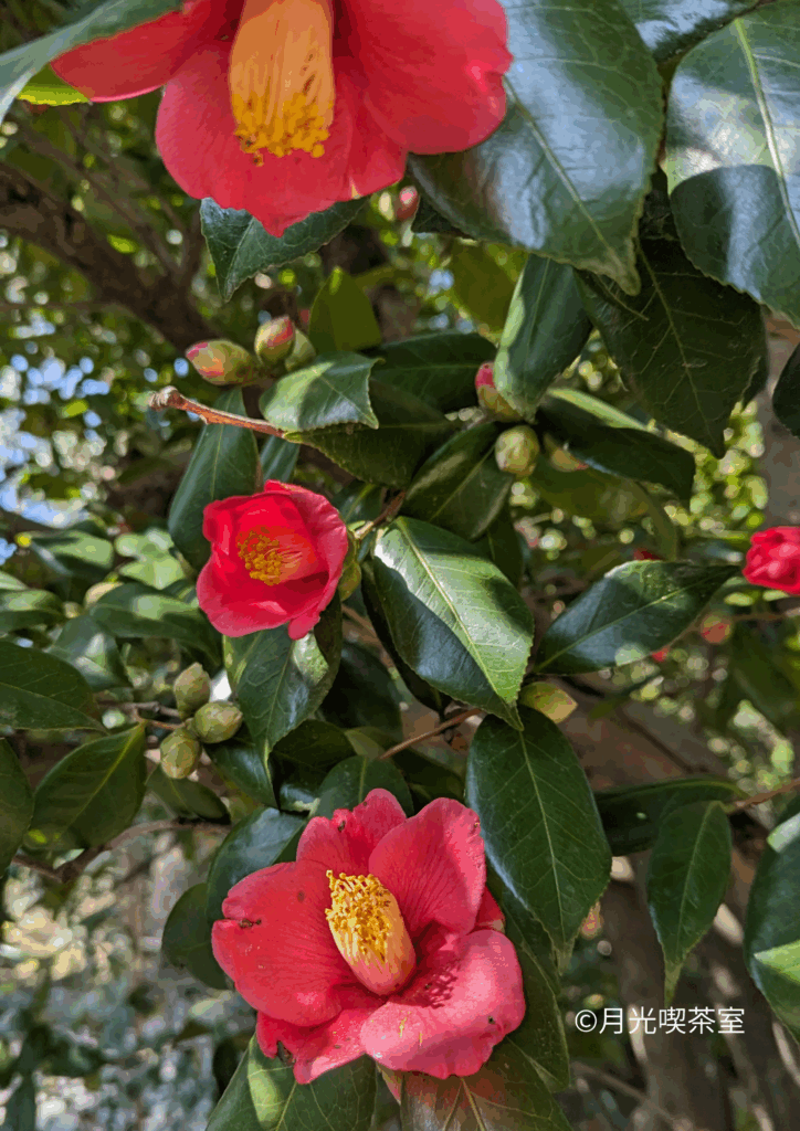 椿の木々に囲まれ日陰になっている通路から眺めると、