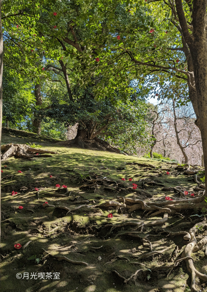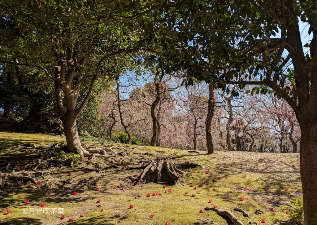見事な春の山を通り過ぎると、空気が一変する「しだれ梅と落ち椿」の景色が待っています。