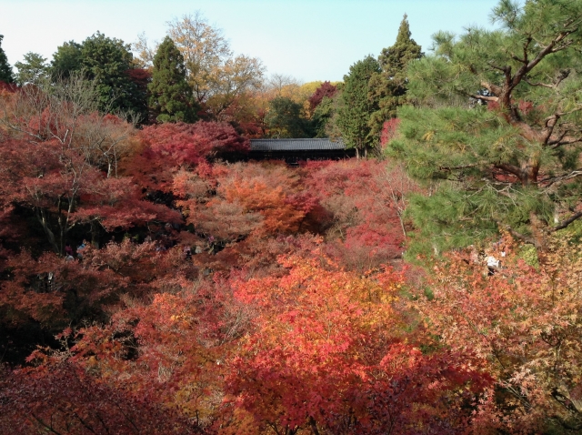 京都で紅葉といえば外せないのが東福寺。特に有名なのが通天橋から眺める渓谷の紅葉で、赤や黄色のグラデーションが見事です。