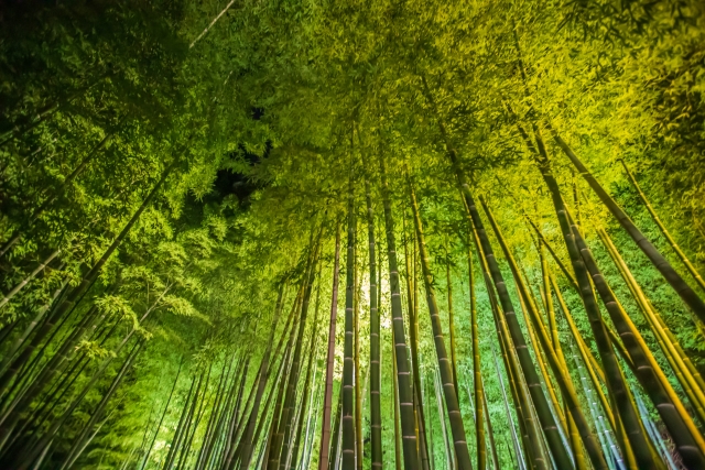 臥龍池に映り込む紅葉、竹林のライトアップは息をのむ美しさ。一人旅で訪れても、幻想的な雰囲気に癒されること間違いなしです。